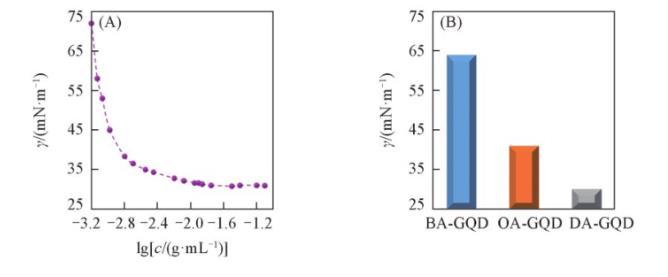 為了研究烷基鏈中碳原子數(shù)對(duì)表面活性的影響,按照1.2.1節(jié)方法,用丁胺和辛胺代替十二胺,分別制備了丁胺功能化石墨烯量子點(diǎn)(BA-GQD)和辛胺功能化石墨烯量子點(diǎn)(OA-GQD),并測(cè)定其最低表面張力。由圖3(B)可知,DA-GQD的表面張力比BA-GQD和OA-GQD的表面張力低得多,表現(xiàn)出更好的表面活性。3種石墨烯量子點(diǎn)的主要區(qū)別在于烷基胺的碳鏈長(zhǎng)度,結(jié)果表明,烷基碳鏈長(zhǎng)度對(duì)石墨烯量子點(diǎn)的表面活性有較大影響,烷基鏈越長(zhǎng),表面活性越好。上述規(guī)律與經(jīng)典的表面化學(xué)理論一致。