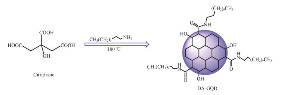 首先采用“自上而下”法,由CX-72炭黑在濃硝酸中回流24 h制備GQD。雖然能夠?qū)崿F(xiàn)一步同時(shí)制備單層和多層GQD,但是存在反應(yīng)時(shí)間長(zhǎng)、強(qiáng)酸會(huì)對(duì)環(huán)境造成一定污染等弊端。本實(shí)驗(yàn)設(shè)計(jì)通過(guò)“自下而上”法,以檸檬酸為前驅(qū)體、直鏈烷基胺為功能化試劑,通過(guò)一步熱裂解制備雙親性DA-GQD(見(jiàn)圖1)。檸檬酸分子之間脫水縮合形成六邊形sp2碳原子鍵合的石墨烯片,十二胺通過(guò)氨基與檸檬酸上的羧基縮合,將烷基鏈引入石墨烯片的邊緣以提高疏水性。