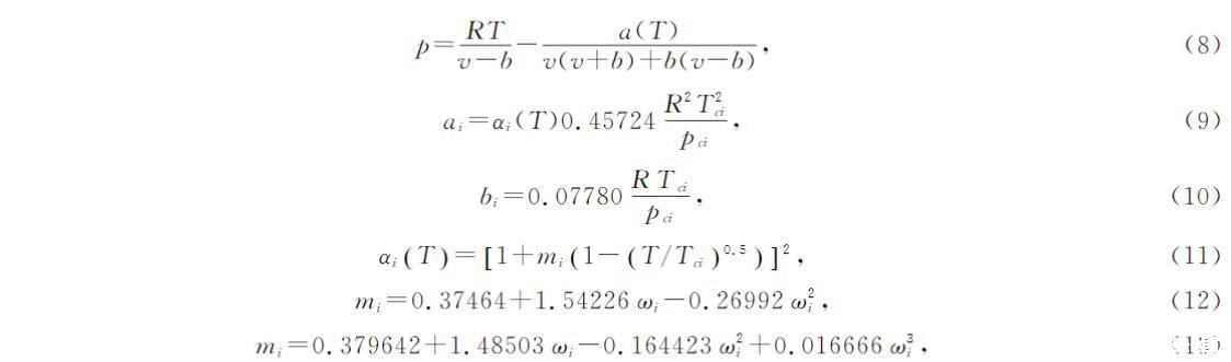 式中p為平衡壓力,單位是Pa;R為理想氣體常數,單位是J/mol/K;T為溫度,單位是K;v為摩爾體積,單位是m3/mol;Tc為臨界溫度,單位是K;Pc為臨界壓力,單位是Pa;ω為偏心因子。