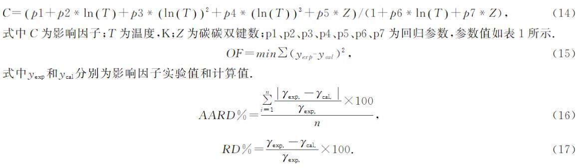 式中C為影響因子;T為溫度,K;Z為碳碳雙鍵數;p1、p2、p3、p4、p5、p6、p7為回歸參數,參數值如表1所示。