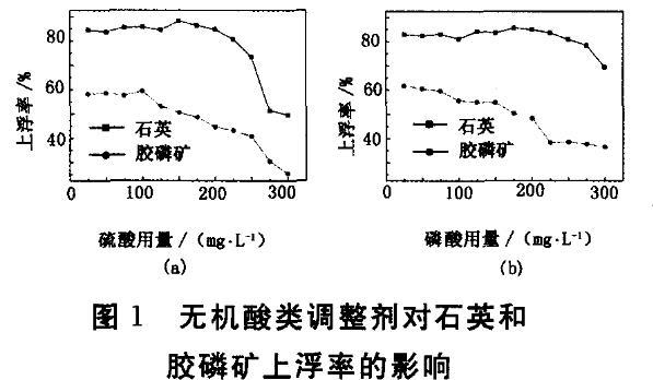 硫酸和磷酸是較為有效的膠磷礦抑制劑,工業(yè)應(yīng)用廣泛。考察傳統(tǒng)調(diào)整劑對(duì)石英和膠磷礦可浮性的影響,結(jié)果見(jiàn)圖1。