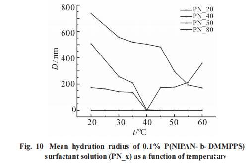 從Fig.10可以觀察到,低溫條件下,PN_20的平均水合半徑大約為500nm,PN_50的水合半徑在750nm左右。此階段,這2種聚合物均形成了膠束結構,并從水溶液中析出。當溫度升高時,兩者的水合半徑均表現出明顯的減小趨勢,表明它們在水中的溶解度增加。特別地,對于PN_50而言,激光納米粒度儀的測量結果顯示,其水合半徑發生突變的溫度區間位于40℃至45℃之間。這一發現指出,PN_50在該溫度范圍內經歷了熱敏性質的顯著變化,可能由于溫升引起的聚合物鏈構象改變或膠束結構的解離。相反,PN_40低溫時平均水合半徑接近于0,溶解性較好,而高溫時其水合半徑逐漸增大,接近400nm,從溶液中析出。其中PN_40所測得的LCST與透光率結果一致。隨著溫度升高,PN_20和PN_80分子在溶液中形成大的聚集體,激光粒度儀測定的是上清液的粒徑,因此粒徑變小,甚至觀察不到納米粒子。