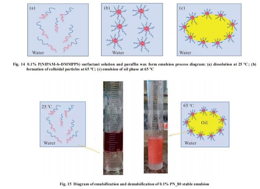Fig.14展示了P(NIPAM-b-DMMPPS)形成乳液的機理圖,在25°C時,P(NIPAM-b-DMMPPS)雙嵌段聚合物的PNIPAM鏈段和PDMMPPS鏈段都處于親水狀態(tài)并且舒展開來,使得其能夠溶解在水中。因為在這個溫度時,PNIPAM鏈段的酰胺基與水分子之間形成了氫鍵,表現(xiàn)出親水性,而PDMMPPS鏈段親水性強,能與水分子相互作用,使整個聚合物分子充分溶解。當(dāng)溫度升高到65°C時,PNIPAM鏈段的氫鍵在高溫時被破壞,導(dǎo)致其變得疏水并發(fā)生收縮;與此同時,PDMMPPS鏈段依然保持親水性并舒展開來。這種不同的溫度響應(yīng)性質(zhì)使得P(NIPAM-b-DMMPPS)聚合物在水溶液中形成了以疏水的PNIPAM為核,親水的PDMMPPS為殼的微米級球狀膠體顆粒。在這種結(jié)構(gòu)形態(tài)下,當(dāng)表面活性劑(即這種雙嵌段聚合物)與油混合并進行乳化時,疏水的PNIPAM核可以與油相容,而親水的PDMMPPS殼則可以與水相容,從而穩(wěn)定地分散在連續(xù)水相中。這樣,就形成了穩(wěn)定的乳液。