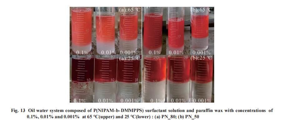 選用PN_80和PN_50進行乳化性能測試,以石蠟油為模擬油,配置質(zhì)量分數(shù)分別為0.1%,0.01%和0.001%的表面活性劑水溶液,以油水比1:1組成油水體系,乳化結(jié)果如Fig.13所示。在65℃時,探討不同濃度的PN_50表面活性劑溶液形成乳液的能力時,觀察到質(zhì)量分數(shù)為0.1%和0.01%的溶液都能形成穩(wěn)定的乳液,而質(zhì)量分數(shù)為0.001%的溶液則不能形成穩(wěn)定的乳液。這一現(xiàn)象可以通過分析表面活性劑分子在界面上的分布和作用來解釋。首先,表面張力測試結(jié)果表明,在較高質(zhì)量分數(shù)(0.1%和0.01%)下,PN_50表面活性劑能夠有效地降低水的表面張力,這是因為表面活性劑分子能夠在水和油的界面上形成一層致密的膜,從而降低界面張力,促進乳液的形成和穩(wěn)定。在這種濃度下,表面活性劑分子的數(shù)量足夠多,可以完全覆蓋在分散相液滴的表面,形成一層保護性的膜,阻止液滴之間的合并。然而,當(dāng)質(zhì)量分數(shù)降至0.001%時,表面活性劑分子數(shù)量顯著減少,不足以在界面形成連續(xù)且有效的覆蓋層。這導(dǎo)致無法有效降低表面張力,同時也無法防止分散相液滴之間的直接接觸和合并,因此無法形成穩(wěn)定的乳液。25℃時,PN_503種濃度表面活性劑溶液都能夠發(fā)生破乳。對于PN_80來說,65℃時,質(zhì)量分數(shù)為0.1%,0.01%,0.001%的表面活性劑溶液均發(fā)生了乳化,25℃時,各乳液均能發(fā)生破乳,通過比較發(fā)現(xiàn),0.01%和0.001%2種表面活性劑溶液破乳效果更好。乳化實驗結(jié)果表明,在一定的濃度范圍內(nèi),PN_80和PN_502種溶液均能夠在65℃發(fā)生乳化,25℃發(fā)生破乳,體現(xiàn)了該嵌段表面活性劑具有良好的溫度誘導(dǎo)的乳化、破乳行為。