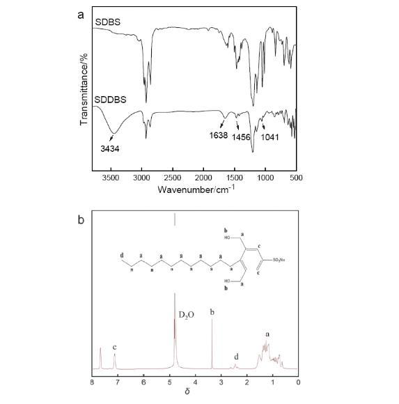 界面潤濕性調(diào)控驅(qū)油劑SDDBS的合成示意圖如圖1所示.通過紅外光譜和核磁共振氫譜對合成原料十二烷基苯磺酸鈉(SDBS)和最終產(chǎn)物二羥甲基十二烷基苯磺酸鈉(SDDBS)進(jìn)行結(jié)構(gòu)表征.由圖2a可見,位于1456和1638 cm-1的特征峰證明了苯環(huán)的存在,3434 cm-1處寬峰為O―H的伸縮振動峰,通過對比SDBS和SDDBS的紅外光譜,可以判斷SDDBS中含有羥基基團(tuán).由圖2b可得,δ4.8為D2O溶劑峰;δ0.6~1.49為亞甲基上的質(zhì)子峰(a);δ2.32~2.60的三重峰為甲基上的質(zhì)子峰(d);δ3.35為羥基上的質(zhì)子峰(b);δ7.14為芳烴特征峰(c).通過1H NMR確定了最終產(chǎn)物中羥基等基團(tuán)的存在及位置.紅外光譜和核磁共振氫譜結(jié)果表明目標(biāo)產(chǎn)物SDDBS合成成功,結(jié)構(gòu)準(zhǔn)確.