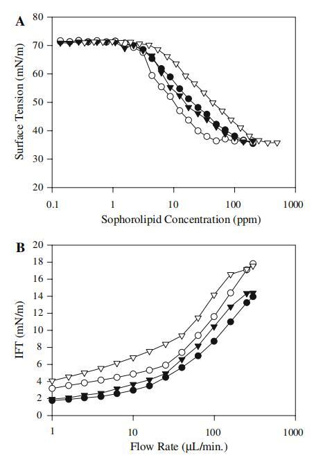 測試表面活性性質,以確定每種SL對水溶性、最小ST、CMC和IFT的影響。 我們發現SL-p和SL-l的水溶性均大于200mg/l,而SL-s和SL-o的水溶性均小于200mg/l。 圖4顯示了SL濃度對水表面張力的影響(圖4a)和流速對IFT的影響(圖4b)。