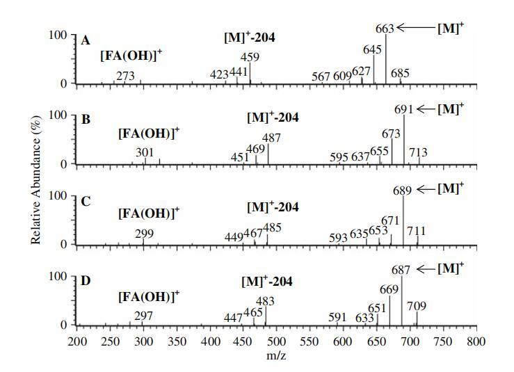 圖3正大氣壓化學電離(APCI)-來自圖2中每個TIC色譜圖基峰的質譜圖。 圖2的TIC中的C16:0二乙酰化槐脂內酯(RT=16.7分鐘)、圖2的TIC中的C18:0二乙酰化槐脂內酯(RT=25.2分鐘)、圖2c的TIC中的C18:1二乙?;敝瑑弱ィ≧T=20.7分鐘)和圖2d的TIC中的C18:2二乙?;敝瑑弱ィ≧T=15.8)。 ([M]+=質子化分子離子;[M]+-204=質子化分子離子-減去乙酰化己糖(質量204);[FA(OH)]+=質子化羥基脂肪酸)