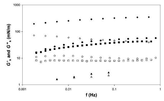 表面剪切流變學。 所有四個系統的表面剪切流變測量如圖11所示。 我們觀察到HFBII具有模量,比b-乳球蛋白和皂甙高一個數量級,這與早期結果一致。25值得一提的是,對于像奎拉葉皂甙這樣的表面活性劑,測得的表面剪切彈性非常高。 b-酪蛋白的表面剪切模量要低一個數量級。 關于頻率,我們發現與HFBII相比,皂甙和b-乳球蛋白對頻率的依賴性更強,尤其是在低頻率下。 此外,對于HFBII而言,Gs 00/Gs0的比率是最低的,即表面彈性對模量的貢獻比表面粘度大得多。 當我們向交叉點外推時,我們預計HFBII和b-乳球蛋白或皂甙之間的弛豫時間會有一個數量級的差異。 對于b-酪蛋白,從0.01 Hz左右的數據可以很容易地觀察到交叉點。