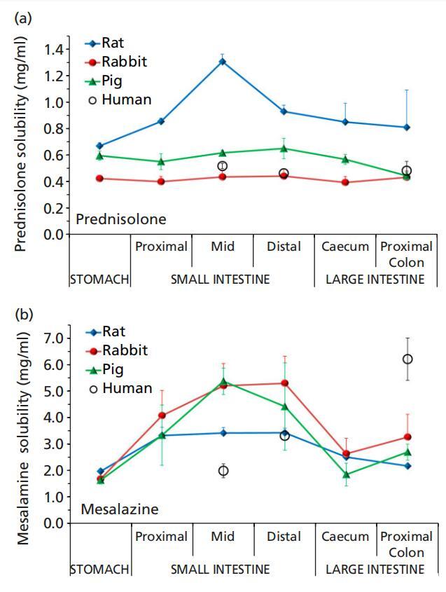 圖4(a)潑尼松龍和(b)美沙拉秦在大鼠(8只大鼠)、兔子(n=6)和豬(n=3)胃腸液(上清液)中的溶解度,F(xiàn)adda等人的人類(lèi)數(shù)據(jù)。[11]