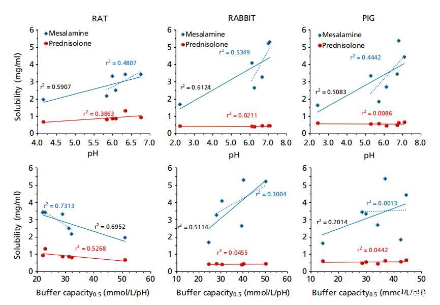 需要注意的是,F(xiàn)adda等人[11]報(bào)告了使用體液的相關(guān)性 未考慮胃液中的溶解度,這在此處介紹的動(dòng)物液中的相關(guān)性中得到了解釋。有趣的是,在排除動(dòng)物液中的胃溶解度后,人和動(dòng)物液中的相關(guān)性變得相似(圖5中的虛線(xiàn)) 此外,盡管區(qū)域pH值和緩沖容量較高,但豬遠(yuǎn)端小腸的平均溶解度并不高于中小腸(表1),這可以通過(guò)該區(qū)域較高的表面張力(44±6 vs.35±3)來(lái)解釋 表面張力與美沙拉秦在兔子體內(nèi)的溶解度之間存在一定的親和力(標(biāo)準(zhǔn)化系數(shù)β)= ? 0.802,P=0.055;r2=0.643)。需要注意的是,用于產(chǎn)生這些相關(guān)性的pH值對(duì)應(yīng)于液體上清液中的測(cè)量值,這不一定與腸道中的原位pH值相關(guān)。