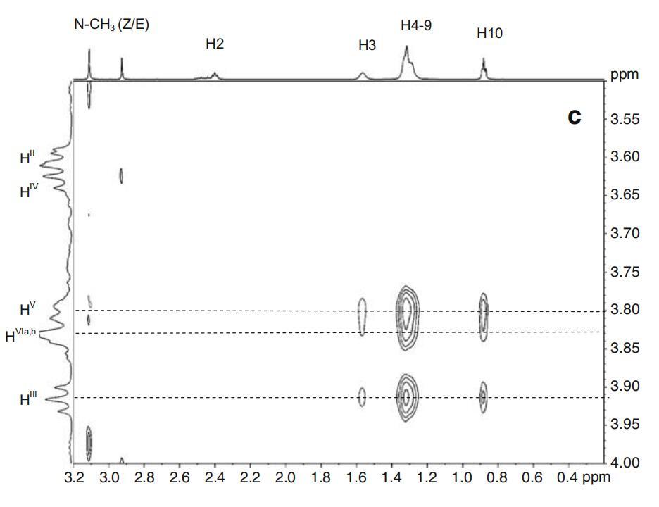 圖7a顯示了α-CD、DPS和Mega-10的示意圖,以簡化表面活性劑原子與CD原子的相互作用。2DROESY數據證明表面活性劑的烷基鏈包含在α-環糊精的疏水腔中。光譜如圖7b和c所示。可以看到表面活性劑共振與位于環糊精空腔內的HIII、HV和HVI共振的交叉峰。未觀察到分子(HI、HII和HIV)外部與環糊精原子的相互作用。對于這兩種表面活性劑,與HIII和HV的相互作用似乎覆蓋了從末端甲基到H3的整個烷基鏈。這意味著幾個不同的復雜幾何形狀和穿透深度之間的快速交換。在鎘原子和親水性頭基之間沒有觀察到相互作用。
