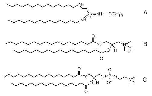 圖1.(A)雙14酰胺的分子結(jié)構(gòu);(B)DPTAP;和(C)DPPC。