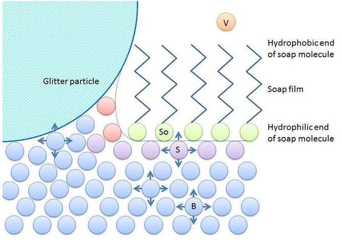 而水和乙醇的比例直接使得液體的表面張力發生了變化。液體的表面張力是由于表層的液體分子之間的作用力遠大于液體-空氣的吸引力所導致。而表層的水分子之間的吸引力使得水與空氣的交界面具有收縮的吸力,這就表現為了液體的表面張力。