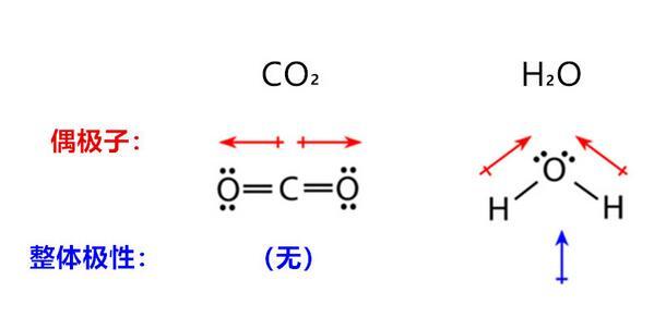如果分子是由兩個(gè)以上原子組成,在確定分子是極性還是非極性時(shí),還必須考慮分子的幾何形狀。下圖顯示了二氧化碳分子與水分子之間的比較,二氧化碳是線性分子,偶極子因強(qiáng)度相同方向相反而互相抵消,對(duì)外顯示整體分子的極性為零;水分子的兩個(gè)極性鍵有夾角,因此整體對(duì)外顯示出極性。
