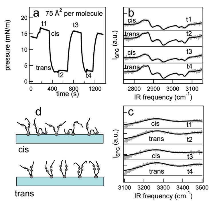 圖5:。(a)在P的反式和順式狀態(tài)下,DT-Azo-5P的純單層在65?2處的歸一化VSFG光譜與SSP極化分別為6和20 mN/m。(b)與a部分類似,但PPP極化。(c)反、順態(tài)SPS極化中的SFG譜(~每分子78?2),壓力為2和15 mN/m。三個面板具有相同的垂直刻度。