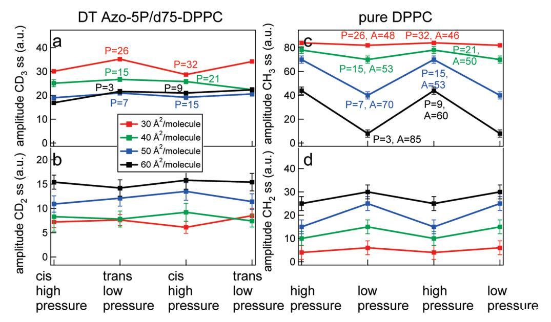 對于脂質混合物,光開關狀態(tài)的影響明顯表現在表面壓力的變化中,但DT偶氮-5P順式和反式狀態(tài)之間的分子水平差異不太明顯。然而,在高密度和高壓下,CD3和CD2拉伸模式的振幅表現出與直覺相反的行為。與高壓狀態(tài)相比,在低壓狀態(tài)下,傳輸狀態(tài)下,CD3模式的振幅更大,CD2模式的振幅更小。對于DPPC的純層,壓力越高,CH3對稱拉伸模式的信號越高,CH2模式的信號越低。顯然,光開關的存在以一種不同的方式影響DPPC脂質尾部的結構,這僅僅是因為壓力的變化。