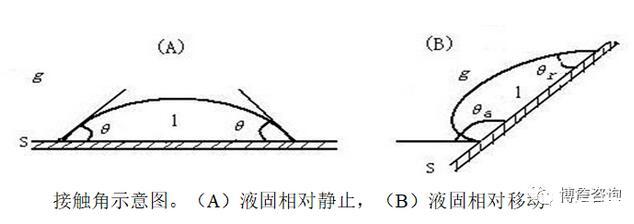 將一液體滴到一平滑均勻的固體表面上,若不鋪展,將形成一平衡液滴,其形狀由固液氣三相交界面處所作氣液界面之切線經液滴至固液界面所成之夾角決定,此角稱為該種液體在所研究固體表面上之接觸角,或稱潤濕角。接觸角常以θ表示。