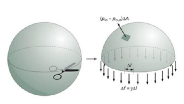 我們很容易就會(huì)看到,由于表面張力的存在,此時(shí)內(nèi)部的壓力肯定要大于外部壓力。其實(shí)這個(gè)很容易理解:一個(gè)氣球就是典型內(nèi)部壓力大于外部壓力的例子,這種壓力差,就是有張力的皮膜形成的。那么,這種壓力差的大小是由什么決定的呢?