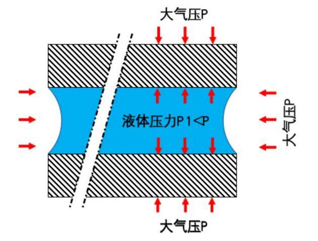 簡(jiǎn)言之,上面的圖稍微有點(diǎn)錯(cuò)誤:水和大氣的界面不是平的,而應(yīng)該是一個(gè)凹液面。而恰恰是這個(gè)凹液面,導(dǎo)致了完全不同的結(jié)果。具體講,就是使得液體內(nèi)部的壓力低于外部的大氣壓力。