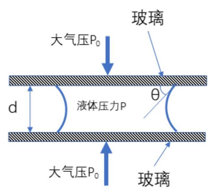 在兩片玻璃之間,形成的凹液面就是因?yàn)檫@個(gè)接觸角的原因: