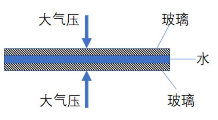 流行科普上講,由于玻璃之間充滿了水,它們之間沒有空氣,因而靠大氣壓就可以把它們緊密地?cái)D壓在一起。如下圖所示: