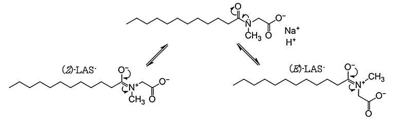 Bordes等人研究了氫鍵對甘氨酸鹽和肌氨酸鹽自組裝的影響[17]。Gad等人研究了具有不同碳鏈長度的N-酰基肌氨酸鹽的界面張力[3]。還對含有SLA的二元混合物與Gemini表面活性劑[18]和陽離子聚合物[19]進行了一些界面研究。然而,這些研究沒有考慮它們的pH影響。Tsubone等人在pH值為10.5[20]時對SLA進行了界面張力測量。然而,SLAS水溶液的界面張力在很大程度上取決于pH,在膠束前和膠束后區域中,當pH小于約7時,其值顯著下降。cmc和C20在較低pH下也會降低,但cmc/C20比在pH<7.3時增加。該比值的增加通常意味著親水頭的尺寸增加和/或與反陽離子的締合增加。在pH<7.3時,Γmax也急劇增加。這些結果清楚地表明,在空氣-水界面的較低pH區域,SLA的Na+陽離子被H+取代。向溶液中加入Tl+,證實LAS的界面張力?并且它們以H+<Na+的順序增加,這與這些結果一致。此外,我們使用1H-NMR和13CNMR研究了D2O和CD3OD中HLA和SLA的結構差異。根據這些結果,例如,來自LAS親水部分中1小時的所有信號?可以想象,HLA和SLA都具有共振結構,(Z)-LAS?和(E)-LAS?,如圖9所示。通過NMR[21,22]的膠束化也報告了這些SLAS異構體的存在。根據分裂峰的積分比,Z/E形式的豐度比確定為SLA為1:1,HLA為2:1。由于E型比Z型體積大,這可能是Γmax隨pH值增加而減小的第二個原因,直到pH值為7.3。另一方面,除了RB的各向異性(在pH<7時明顯增加)外,含水體中的膠束性質對pH的依賴性小于界面性質。然而,在pH值降低時,聚集數和流體動力學半徑的小幅度增加趨勢以及膠束核的微極性的減小趨勢可以很好地解釋為LAS親水性頭基團之間的靜電力減小?由Na+到H+的反陽離子置換引起,與界面性質的情況相同。雖然我們尚未確定界面和膠束中HLA的pKa值,但這些值應大于水溶液中的pKa值(pKa,bulk=3.3);界面處的值可能略大于膠束中的值。pH<7時體積較小的Z型的增加也與膠束性質相容,并可能與膠束親水部分附近RB各向異性的增加直接相關。