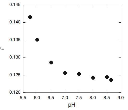 圖8:若丹明B在SLAS膠束(r)處的熒光各向異性與CS=25mM時pH的關系圖
