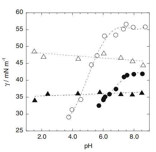 圖3 CS=1.0和25mm時界面張力(γ)與pH的關系圖:白色crcles 1.0mm SLAS,白色三角形1.0mm SDS,黑色圓圈25mm SLAS,黑色三角形25mm SDS
