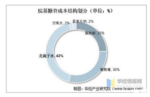 從上游成本結構來看,烷基糖苷主要原材料是去離子水、葡萄糖和脂肪酸,分別在成本結構占比43%、30%、25%。