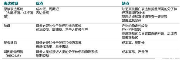 膜蛋白的表達系統:原核表達(大腸桿菌、紅桿菌屬)、哺乳細胞(HEK293F)、酵母表達、昆蟲細胞表達。不同的表達系統的優缺點見下圖。