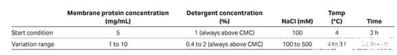 當篩選去垢劑時,要注意每個去垢劑的臨界膠束濃度(CMC)。CMC是指自由的去垢劑分子形成膠束結構需要的濃度。因為溶液相當于膜蛋白從細胞膜上去除進入去垢劑膠束,所以CMC是蛋白提取所需的最低濃度。CMC值可參考表二。