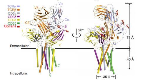 通過冷凍電鏡分析,TCR–CD3復合物的最終原子模型包含全長TCRαβ的亞基,完整的ECD和跨膜螺旋CD3γε,CD3δε和CD3ζζ