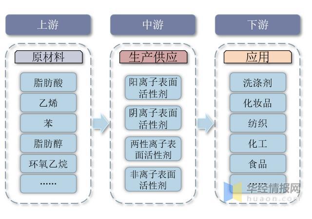表面活性劑行業(yè)產(chǎn)業(yè)鏈上游主要為脂肪酸、乙烯、苯、脂肪醇、環(huán)氧乙烷等原材料;中游為表面活性劑生產(chǎn)供應(yīng)環(huán)節(jié),主要包括離子和非離子表面活性劑;下游主要應(yīng)用于洗滌劑、化妝品、紡織、化工、食品等領(lǐng)域。