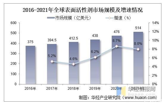 2016-2021年全球表面活性劑市場規(guī)模及增速情況