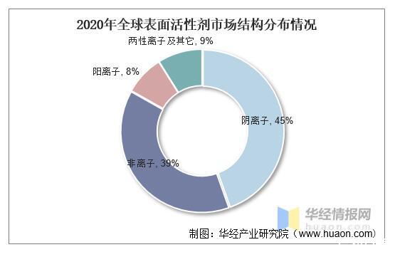 從市場結(jié)構(gòu)來看,2020年全球表面活性劑市場中,陰離子和非離子是其最主要的細(xì)分領(lǐng)域,占比分別為45%和39%,陽離子和兩性離子及其它占比分別為8%和9%。