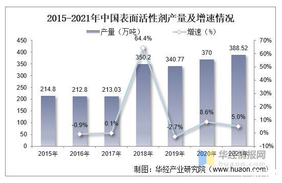 2015-2021年中國表面活性劑產(chǎn)量及增速情況