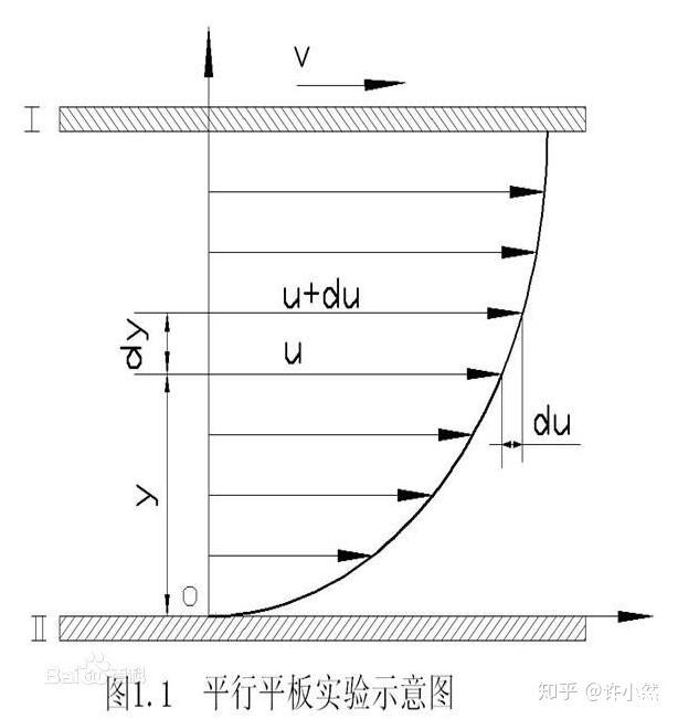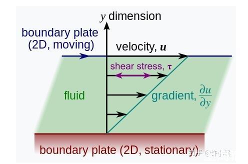 在這張圖中,下方的平板和兩個平板間的液體保持相對靜止,且液體內(nèi)部沒有對自身體內(nèi)不同質(zhì)點的相對流動,而將上方平板做水平向右的推動。可以看見,在與上方平板直接接觸的一層液面處可以達到與被推動的平板相同的速度,而在垂直距離上越遠離上層平板的部分的速度越慢,直到最下層與下方平板直接接觸的液面處速度為零,在兩個平板之間存在一個連續(xù)變化的速度分布。