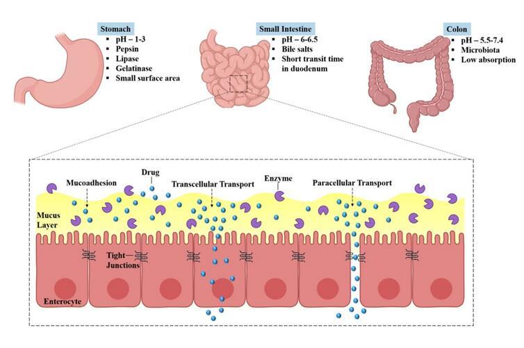 口服藥物在經歷胃部的生理障礙后到達小腸。在小腸(十二指腸)的入口處,胰酶會引發幾種酶促轉化,這些酶還可能導致首過代謝,從而導致藥物生物利用度降低。因此,口服藥物必須克服這些生理學障礙。