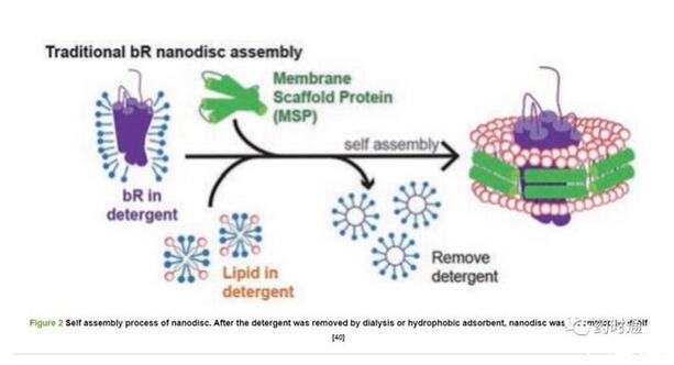 納米盤由磷脂和兩親性螺旋蛋白,也稱膜支架蛋白(membrane scaffold protein,MSP)組成。一般由130~160個(gè)磷脂形成含MPs的雙分子層,然后由MSP作為與MPs結(jié)合的疏水基團(tuán)保持其天然構(gòu)象[38]。單個(gè)MPs可形成150 kDa大小的納米盤。組裝納米盤時(shí),首先將MSP按照一定比例與預(yù)先溶解在洗滌劑(通常是膽酸鈉)中的磷脂混合,孵育一段時(shí)間后利用透析或疏水吸附劑去除洗滌劑,隨后納米盤自行組裝形成納米級(jí)別類膜結(jié)構(gòu)圓盤[39]。組裝包含MPs的納米盤只需在體系中再加入適量MPs,其自組裝過(guò)程與空納米盤相似。包含MPs的納米盤與空納米盤通過(guò)生化手段進(jìn)行分離,隨后用分子排阻色譜進(jìn)一步純化,過(guò)程如圖2所示[40]。