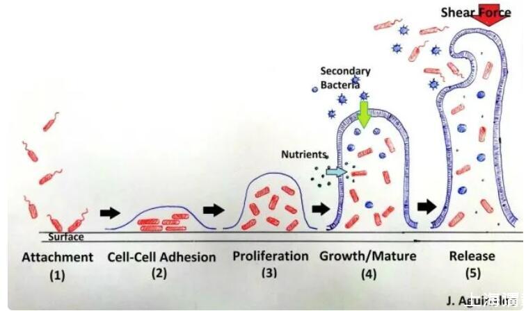 生物膜為微生物分泌物,常見于制藥、食品與個(gè)人護(hù)理行業(yè)的生產(chǎn)或水系統(tǒng)中。生物膜可顯著提高微生物對(duì)惡劣環(huán)境和消毒劑的抗性,并持續(xù)接納浮游微生物,導(dǎo)致生產(chǎn)或水系統(tǒng)中微生物在清洗消毒后依然頻繁超標(biāo)。