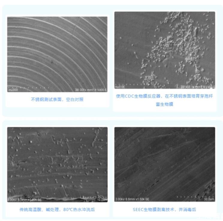 上圖可見,高溫或傳統(tǒng)強(qiáng)酸、強(qiáng)堿工藝處理生物膜,效果不理想。高溫、強(qiáng)酸或強(qiáng)堿無法有效清除已粘附于系統(tǒng)上的生物膜,且無法對(duì)生物膜下微生物進(jìn)行有效殺滅。因傳統(tǒng)方法清除生物膜效果不理想,研究表明,過氧化氫在控制生物膜方面要比氯更有效,過氧化氫通過極強(qiáng)的氧化作用穿透細(xì)胞壁和生物被膜,破壞細(xì)菌的dna,從而杜絕生物膜的產(chǎn)生。