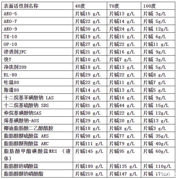 目前市場上常見的各種表面活性劑,包括非離子、陰離子最常用兩大類的耐堿、凈洗、除油和除蠟性能的比較。