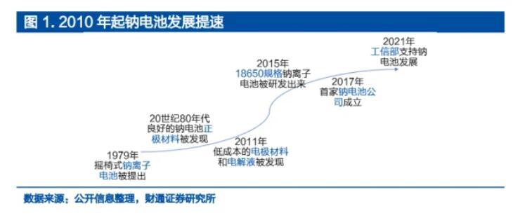 鈉電池隨著產(chǎn)業(yè)化加速,量產(chǎn)在即。1979年法國的Armand提出了“搖椅式電池”的概念,開始鈉離子電池的研究。隨后Delmas和Goodenough發(fā)現(xiàn)了層狀氧化物材料可作為鈉電池正極材料,Stevens和Dahn發(fā)現(xiàn)硬碳材料作為負(fù)極有良好的鈉離子嵌脫性能。2010年以來,鈉電池的研發(fā)進(jìn)程加速。2011年中科院物理所研究員團(tuán)隊(duì)開始了鈉離子電池核心技術(shù)的研發(fā),自此以后開發(fā)出低成本的電極材料。2017年國內(nèi)第一家專注于鈉離子電池研發(fā)和生產(chǎn)的公司中科海鈉成立。2021年寧德時(shí)代成功舉行了第一代鈉離子電池線上發(fā)布會(huì)。2022年,中科海納和傳藝科技均預(yù)計(jì)2023年量產(chǎn)其鈉離子電池。