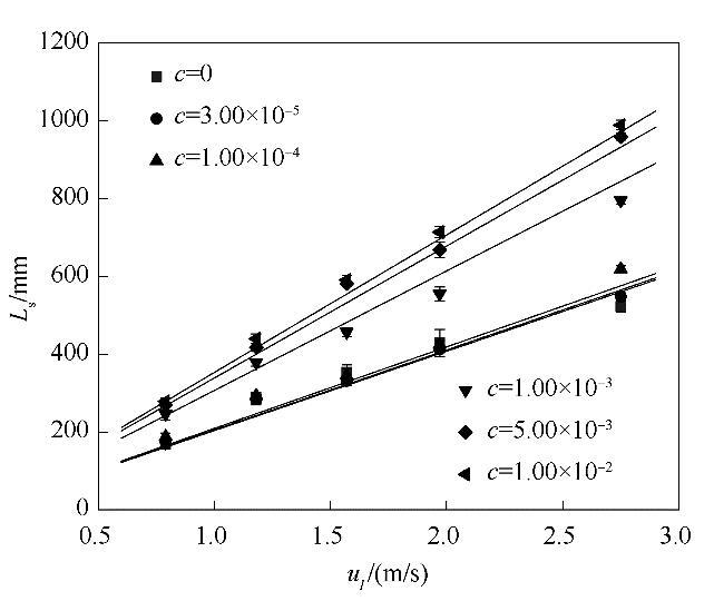 為了定量表征表面張力變化對射流破裂過程的影響,實(shí)驗(yàn)測量了含表面活性劑射流的射流破裂長度。射流破裂長度定義為噴嘴出口至射流首次發(fā)生破裂處的距離。圖6是含表面活性劑射流破裂長度隨射流速度u l的變化趨勢,其中L s(mm)表示含表面活性劑射流的射流破裂長度,L l(mm)為水的射流破裂長度。從圖6(a)中可以看出,當(dāng)表面活性劑濃度保持不變時,提高液體射流速度會增大射流破裂長度。從圖6(b)中可以看出,當(dāng)液體射流速度保持不變時,隨著表面活性劑濃度的增大,射流破裂長度總體上呈現(xiàn)逐漸增大的趨勢;射流速度越大,射流破裂長度增大的趨勢就越明顯。使用相同工況下水的射流破裂長度無量綱化含表面活性劑射流的破裂長度后,可以得到射流破裂長度比隨射流速度以及表面活性劑濃度的變化趨勢,如圖6(c)、(d)所示。從圖中可以看出,表面活性劑的加入顯著增大了射流破裂長度比。在表面活性劑濃度不變時,提高液體射流速度對射流破裂長度比的影響并不顯著。在射流速度保持不變時,提高表面活性劑濃度會導(dǎo)致射流破裂長度比的增大。