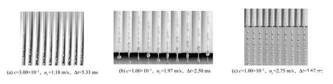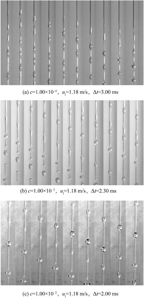 本文首先研究了不含氣泡的表面活性劑射流破裂過程以探究表面張力變化對射流破裂特征的影響。實(shí)驗(yàn)使用高速相機(jī)記錄了六種不同濃度表面活性劑溶液的射流破裂過程。實(shí)驗(yàn)獲得的射流破裂過程如圖5所示,其中Δt是相鄰兩張圖片間的時間間隔。從圖5中可以看出,雖然表面活性劑濃度并不相同,但射流的破裂過程在形態(tài)上是相似的。當(dāng)液體射流離開噴嘴后,射流表面擾動迅速增長,表面波動在射流表面呈對稱分布,這是射流破裂Rayleigh區(qū)的典型特征。隨著表面波動的進(jìn)一步發(fā)展,在射流方向上,射流表面形成瘤狀結(jié)構(gòu),射流破裂發(fā)生在兩個瘤狀結(jié)構(gòu)之間。