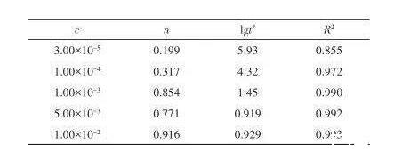 圖4展示了不同SDBS濃度下lg S隨lg t的變化規(guī)律,圖中實(shí)線對應(yīng)各濃度下動態(tài)表面張力的擬合曲線,此時圖中時間t的單位為ms。從圖中可以看出,擬合結(jié)果與實(shí)驗(yàn)數(shù)據(jù)吻合較好,擬合曲線能夠較好地表征動態(tài)表面張力的時間演變趨勢。擬合得到的系數(shù)見表1。