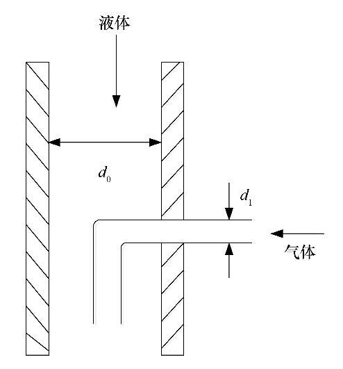實(shí)驗(yàn)流程如圖1所示。來自注射泵的氣體通過充氣通道進(jìn)入噴嘴并在噴嘴內(nèi)形成氣泡,并與來自液體流量計的液體相混合形成氣液混合物。該氣液混合物離開噴嘴后,在不穩(wěn)定波的作用下發(fā)生破裂,使用高速相機(jī)記錄這一過程,并使用開源軟件ImageJ分析處理得到的圖片。實(shí)驗(yàn)通過控制注入噴嘴的氣體流量從而得到不同液體射流速度下直徑近似相等的氣泡。實(shí)驗(yàn)使用的噴嘴如圖2所示。其中,噴嘴內(nèi)徑d 0=2.96 mm,充氣通道外徑d 1=0.50 mm。