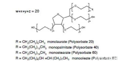 吐溫(Tween或polysorbate)也是一類較為常用的非離子表面活性劑。脫水山梨醇作為中心結(jié)構(gòu),四條PEG鏈段的一端連接在中心單元上。其中一條PEG鏈段的末尾連接脂肪長(zhǎng)鏈。吐溫常見(jiàn)的型號(hào)一般為吐溫20、吐溫40、吐溫、60和吐溫80,這些表面活性劑中,PEG的重復(fù)單元數(shù)目總數(shù)為20,而PEG末端連接脂肪酸長(zhǎng)鏈包括月桂酸、棕櫚酸、硬脂酸和油酸。隨著脂肪鏈長(zhǎng)度的增加,疏水結(jié)構(gòu)的占比增加,HLB下降,但是吐溫是水溶性表面活性劑,這幾個(gè)吐溫的HLB通常都在15以上。吐溫通常用于微乳、自乳化系統(tǒng)和固體分散體中。如果將吐溫中的PEG鏈段去除或替換成脂肪長(zhǎng)鏈,則得到了另一類表面活性劑,司盤(pán)。這是一類非水溶性表面活性劑,HLB通常小于10。