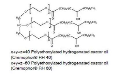 另一類重要的非離子表面活性劑是聚氧乙烯蓖麻油(Cremophor)或聚氧乙烯氫化蓖麻油(Cremophor RH)。蓖麻油是蓖麻油甘油三脂,與環(huán)氧乙烯反應(yīng),親水性的氧化乙烯結(jié)構(gòu)便插入到蓖麻酸和甘油之間,便得到了聚氧乙烯蓖麻油,如果蓖麻油中的雙鍵加氫飽和后,再與環(huán)氧乙烯反應(yīng),那么得到的便是聚氧乙烯氫化蓖麻油。環(huán)氧乙烯和蓖麻油的反應(yīng)位點(diǎn)是隨機(jī)的,因此得到的表面活性劑是一種混合物,也包括未反應(yīng)的蓖麻油和均聚形成的聚氧乙烯。不同種類的聚氧乙烯蓖麻油或聚氧乙烯氫化蓖麻油是通過(guò)參與反應(yīng)的氧化乙烯和蓖麻油或氫化蓖麻油的比例決定的,例如Cremophor EL 40或Cremophor RH 40,其中40代表的便是混合物中氧化乙烯和蓖麻油的摩爾比。這類表面活性劑的HLB一般在12以上,常用作難溶性藥物的增溶。