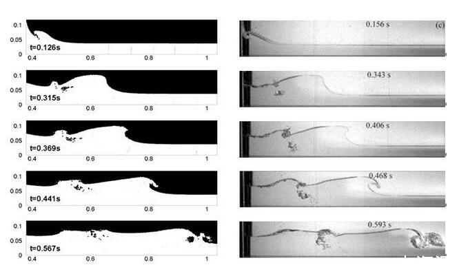 潰壩仿真結(jié)果(左)和實驗結(jié)果[19](右)對比